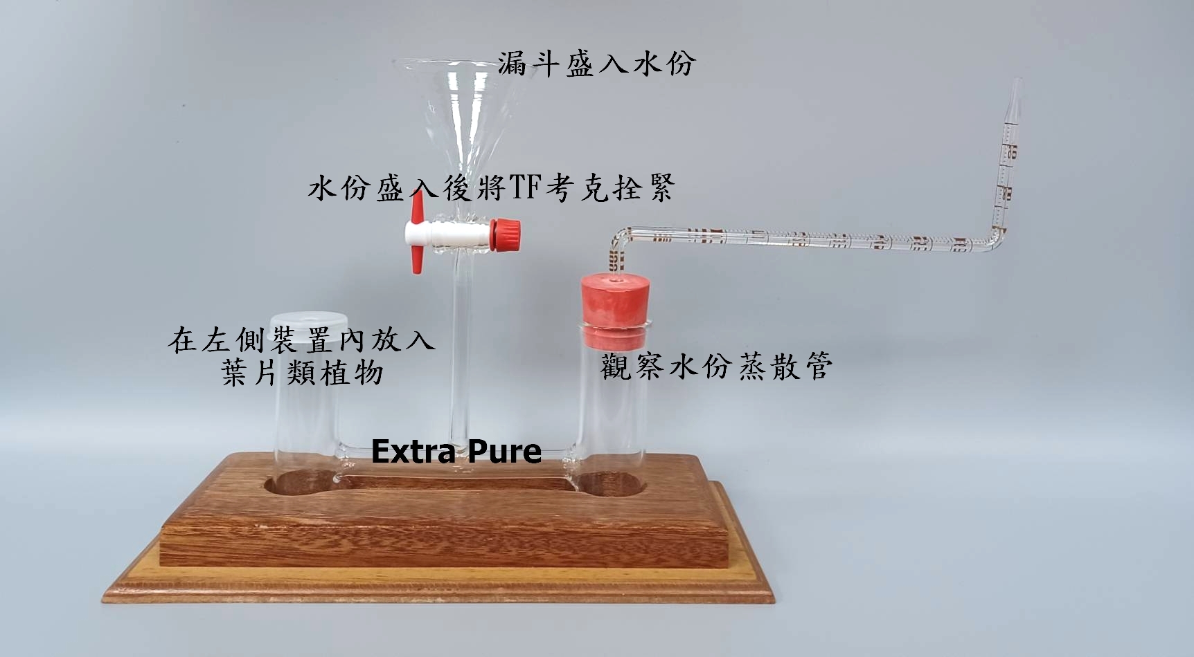玻璃連通盛水裝置1組,觀察水分蒸散管1支,木製底座1台。